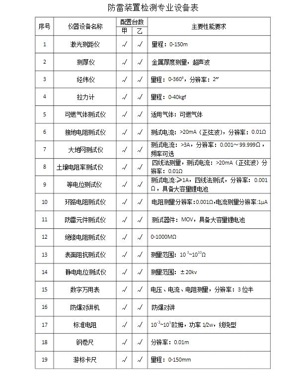 防雷檢測(cè)設(shè)備量具(皮尺、鋼直尺、鋼卷尺、卡鉗、千分尺、螺旋測(cè)微儀、游標(biāo)卡尺、激光測(cè)距儀、測(cè)高儀、經(jīng)緯儀)。工頻接地電阻測(cè)試儀、沖擊接地阻抗測(cè)試儀、土壤電阻率測(cè)試儀、鉗形接地電阻測(cè)試儀(單鉗型回路電阻測(cè)試儀)、地網(wǎng)型接地電阻測(cè)試儀、多功能接地電阻測(cè)試儀。絕緣電阻測(cè)試儀(兆歐表)、環(huán)路電阻測(cè)試儀(N-PE環(huán)路電阻測(cè)試儀)、絕緣/導(dǎo)通測(cè)試儀、數(shù)字微歐表、毫歐表、過(guò)渡電阻測(cè)試儀、等電位測(cè)試儀。數(shù)字萬(wàn)用表、鉗形電流表、漏電電流測(cè)試儀、電力諧波鉗形表、諧波分析儀、漏電開關(guān)測(cè)試儀、電力質(zhì)量綜合檢測(cè)儀、低壓電器綜合測(cè)試儀、頻譜分析儀。