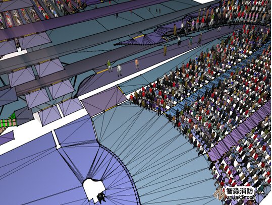 -Pathfinder還專門提供了高性能可視化的3D時間歷程模擬,利用透明化功能來更好地顯示密集人群在樓層中的疏散情況。